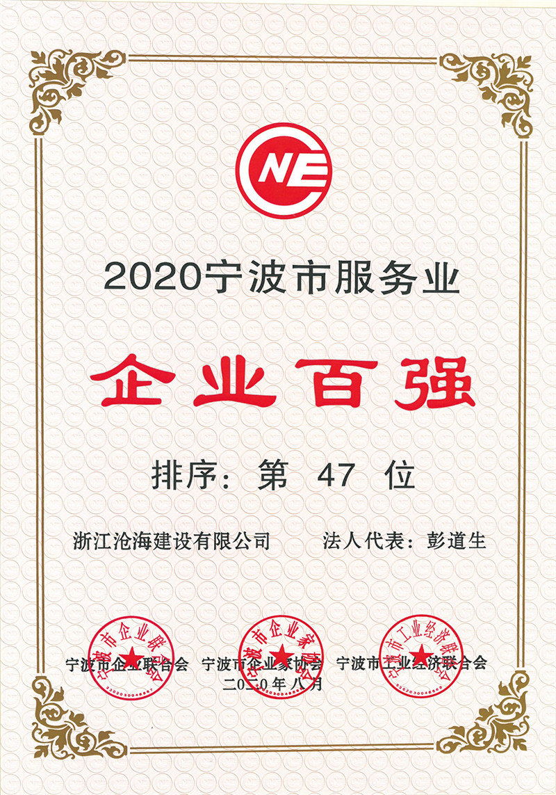 今年,滄海建設(shè)再次光榮上榜,榮登2020寧波市服務(wù)業(yè)企業(yè)百強(qiáng)第47位,較去年提升了15位。