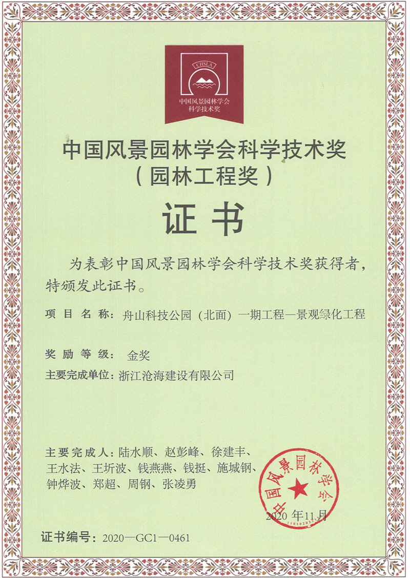 浙江滄海建設(shè)有限公司的舟山科技公園(北面)一期工程—景觀綠化工程在“2020年度中國風(fēng)景園林學(xué)會(huì)科學(xué)技術(shù)獎(jiǎng)” 園林工程子獎(jiǎng)項(xiàng)的頒獎(jiǎng)中,榮獲最高榮譽(yù):金獎(jiǎng)。