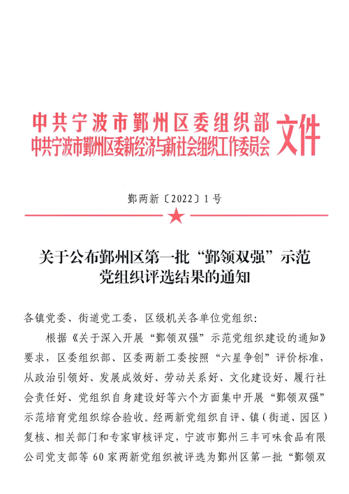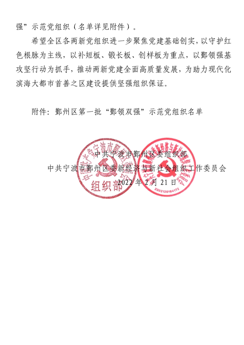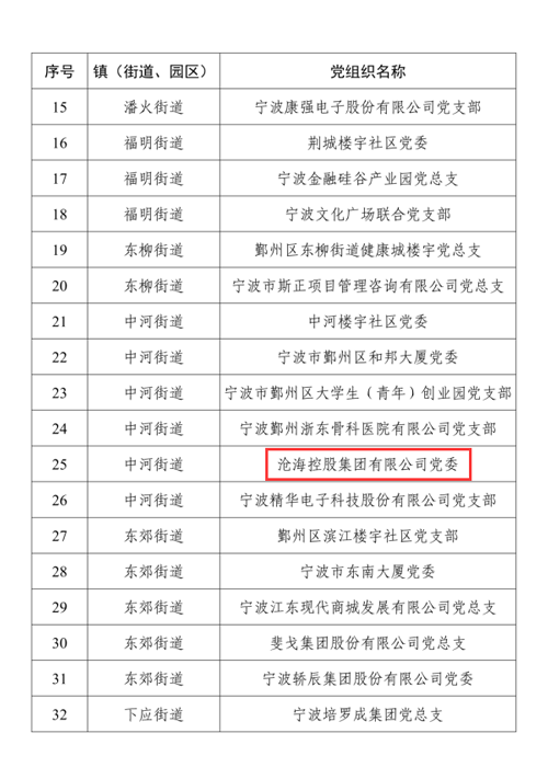 近日,中共寧波市鄞州區(qū)委組織部、中共寧波市鄞州區(qū)委新經(jīng)濟(jì)與新社會(huì)組織工作委員會(huì)公布了鄞州區(qū)第一批“鄞領(lǐng)雙強(qiáng)”示范黨組織,根據(jù)政治引領(lǐng)好、發(fā)展成效好、勞動(dòng)關(guān)系好、文化建設(shè)好、履行社會(huì)責(zé)任好、黨組織自身建設(shè)好等六個(gè)方面集中開展的綜合驗(yàn)收評(píng)定,共60家黨組織入選該名單。其中,滄海黨委被評(píng)選為鄞州區(qū)第一批“鄞領(lǐng)雙強(qiáng)”示范黨組織。