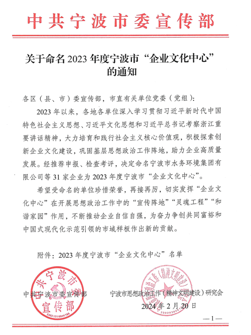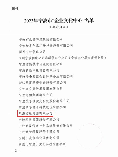 近日,中共寧波市委宣傳部、寧波市思想政治工作(精神文明建設)研究會發(fā)布了2023年度寧波市“企業(yè)文化中心”名單,全市31家企業(yè)獲此殊榮,滄海集團獲評上榜。