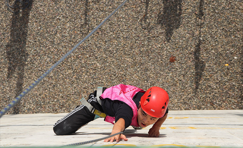 盲目一通亂爬后,到了中間位置,發(fā)現(xiàn)可供攀援的口子越來(lái)越少、間距越來(lái)越大,而體力已開(kāi)始不支?!跋蜃笈?!”、“右手斜上方有個(gè)口子可以借力!”、“別踩那個(gè)斜斜的口子,會(huì)滑脫!”地面上的隊(duì)友紛紛支招。幾位勇敢的滄海隊(duì)員歷經(jīng)多次失敗,但仍努力地不斷嘗試,最后靠著驚人的毅力和隊(duì)友們的引導(dǎo),成功攀到了最高點(diǎn)。