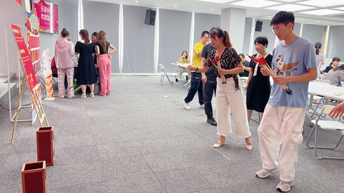 投壺是古代士大夫宴飲時(shí)做的一種投擲游戲,也是一種禮儀。職工手拿箭矢,瞄準(zhǔn),投擲,在投壺游戲中零距離感受傳統(tǒng)文火的魅力,體驗(yàn)一把古人的浪漫。投壺要求有良好的眼力和投擲技巧,“啪!”有的小伙伴技術(shù)不夠,箭直接跌落到地上;“蹦!”有的箭頭已到壺口邊緣,被壺口蹦開落地;“鐺!”有的小伙伴技術(shù)高超,眼力超好,不偏不倚,箭順利掉進(jìn)壺里。